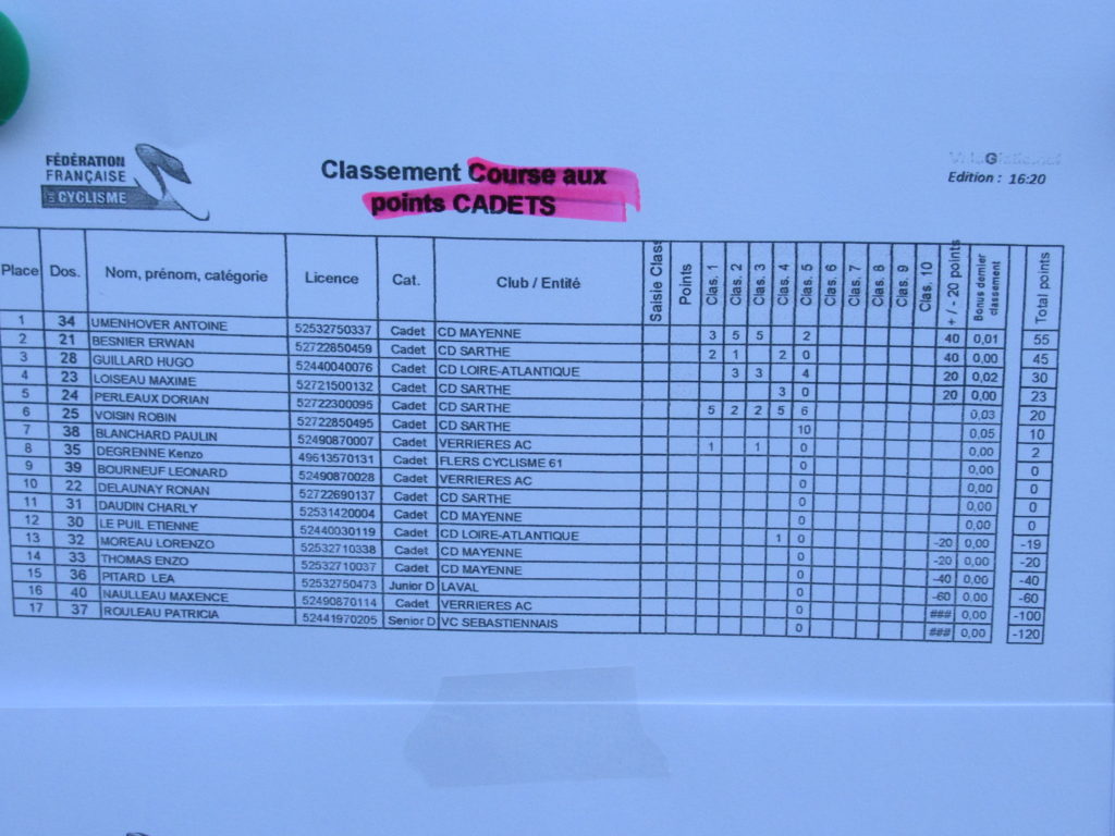 01/09/2018 – Course aux points piste Le Mans – Cadets