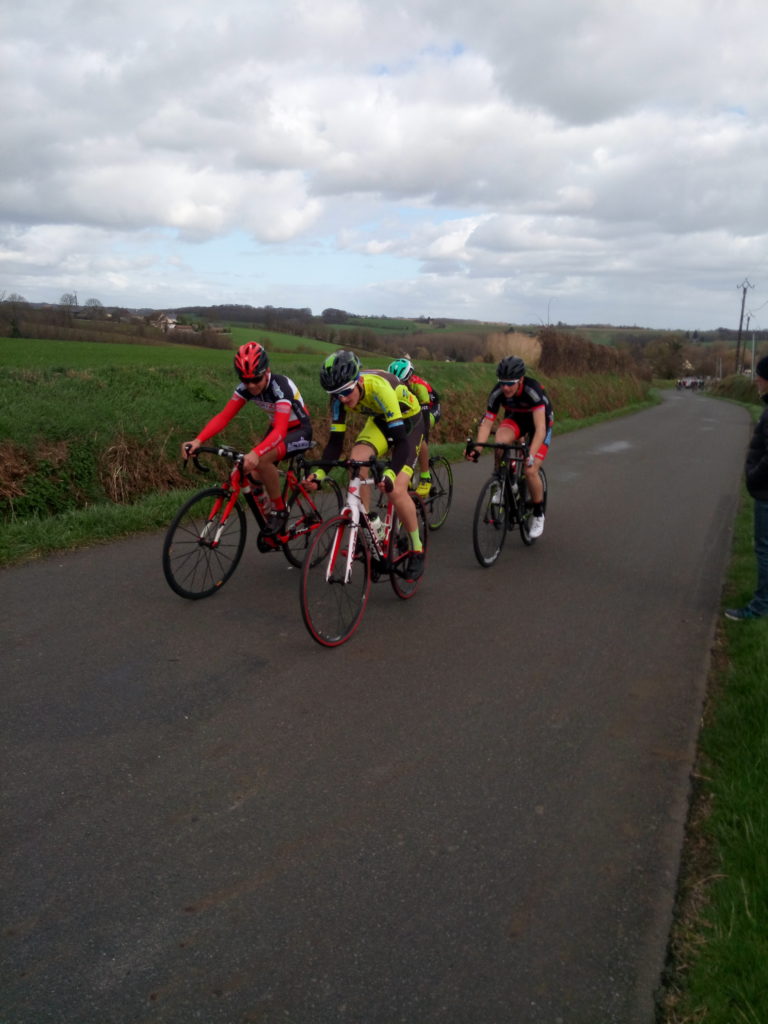 Dès le premier tour une échappée de 4 coureurs se forme avec Aurélien PLESSIS. Derrière eux, beaucoup de cassures et plusieurs petits groupes s’organisent difficilement.