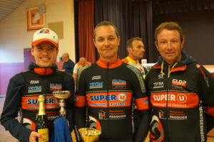 C’est à la fin du 6ème tour qu’un groupe de 4 coureurs se forma sous l’impulsion de Cyril qui déclencha en attaquant vent de face dans une petite bosse la bonne échappée. Ce groupe ira jusqu’à l’arrivée ensemble et se départagerons au sprint sous un sol détrempé. Cyril termine 2ème, comme mardi à St Victeur, il va rejoindre le club fermé des Poulidor de l’UCM, comme Vincent LEBRETON.
