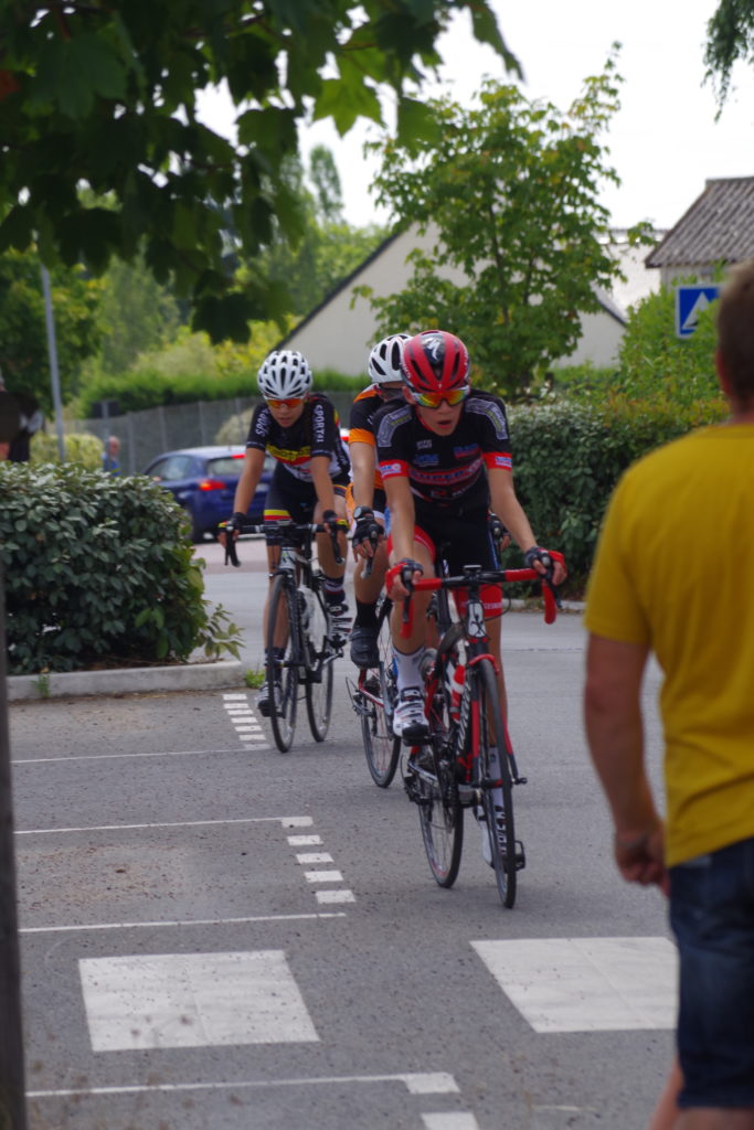 Puis, à environ une dizaine de kilomètres de l’arrivée, un des locaux lance l’attaque. Un petit groupe de 4 coureurs prend quelques longueurs d’avance avec 3 poursuivants. Lucas est dedans. A 2 tours de l’arrivée, une chute sans gravité perturbera ces échappées. Un coureur se lance seul et prendra presque 2 minutes d’avance. Il terminera seul. Derrière le sprint des poursuivants est lancé. Lucas est bien placé dans le dernier virage. Il terminera 2ème de ce sprint.