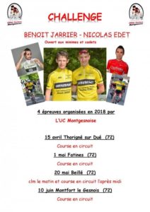 Challenge Benoit JARRIER et Nicolas EDET Minimes / Cadets Vie du club - 23 mars 2018 Les prochaines courses pour le challenge se rapproche alors partager un maximum pour avoir le plus possible de participants.