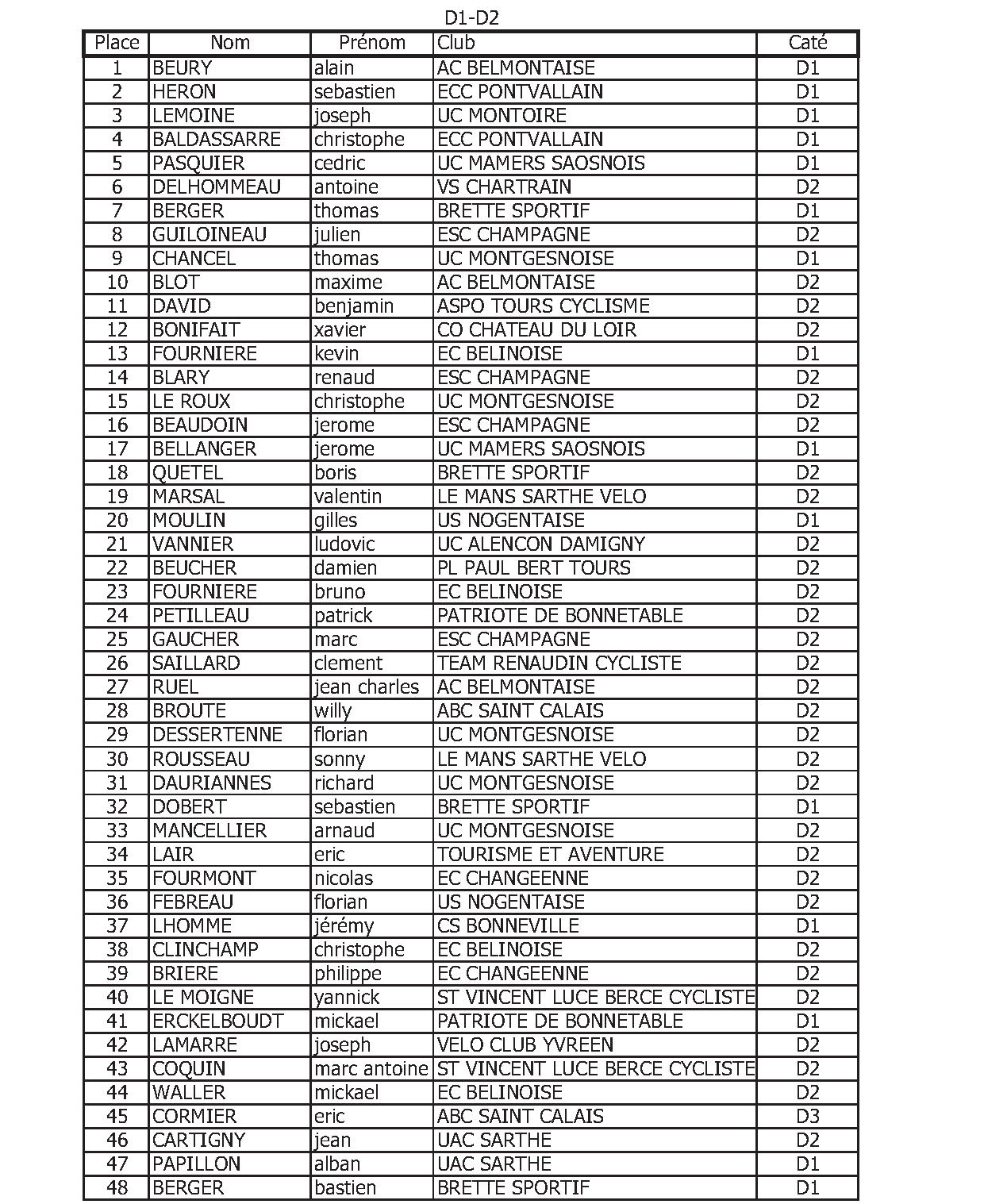 En D1-D2, victoire de Alain Beury (AC Belmontaise), suivi de Sébastien Heron (ECC Pontvallain) et de Joseph Lemoine (UC montoire).