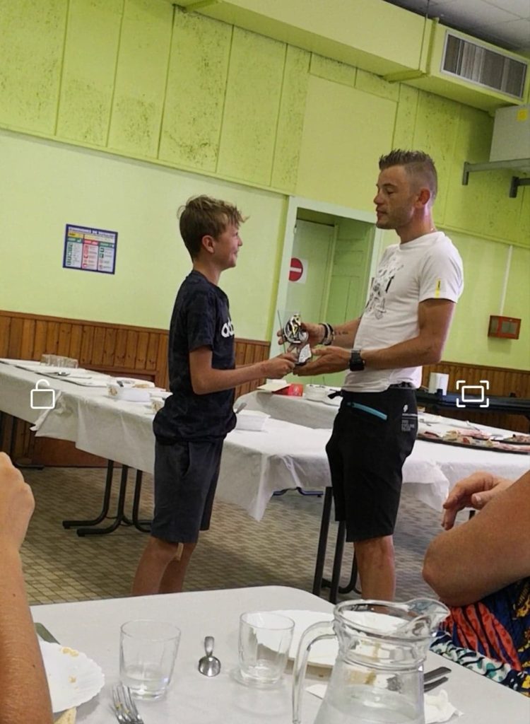 Le stage c’est terminé cet après midi et il est très content de la route et du cyclocross avec beaucoup d’échange avec les plus grands, pour la dernière journée ils ont fait un cyclocross à l’Américaine ou Antonin a eu l’honneur de le faire avec un certain Steve CHAINEL où ils prendront une belle 5ème place sur 9ème.