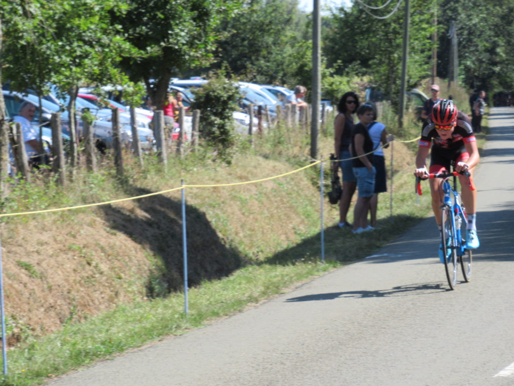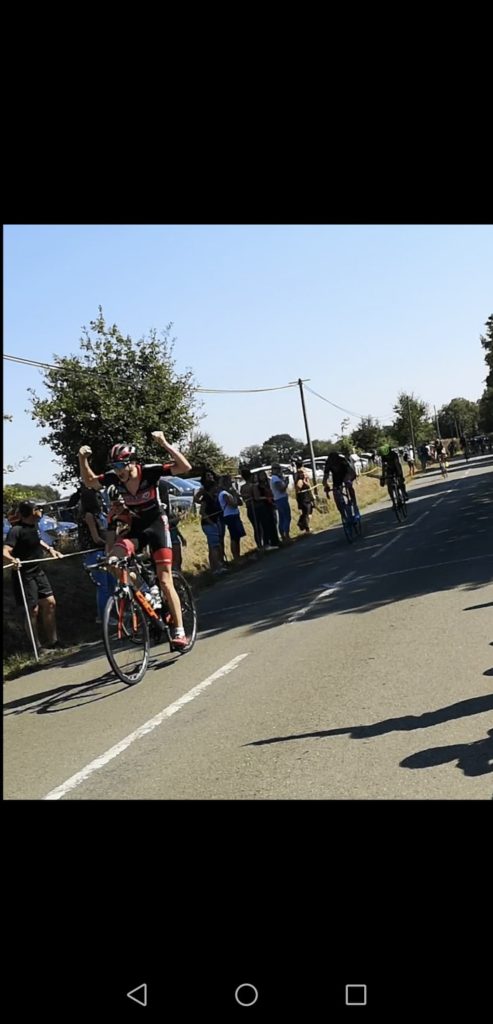 Justin mis le turbo et partit de l’échappée à un tour de l’arrivée mais sera hélas repris par le peloton en haut de la dernière difficulté et c’est à ce moment que Antonin TOUCHARD se positionna pour préparer le sprint du peloton est l’emporter enfin car il tournait autour depuis quelques courses.