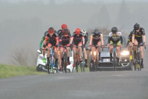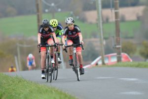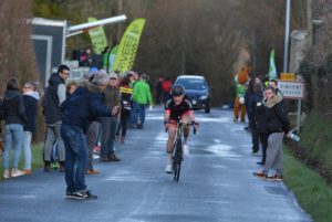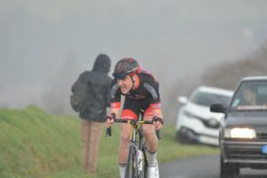 Quelques gouttes au départ et beaucoup de vent pour le premier tour, puis ce fut à Hugo ROUSSET de montrer le premier le rouge et noire en tentant une échappée au 2ème tour, il fut repris et Dorian PERLEAUX à son tour est sorti au 3ème tour pour compter jusqu’a 2mn 30 d’avance mais hélas fut repris dans le dernier tour (très dur seul et face au vent) et malgré le coaching du président.
