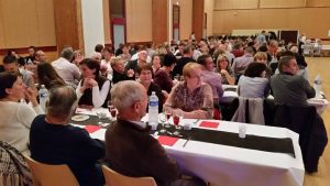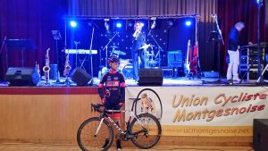 Ce fut d ‘abord notre chanteuse secrétaire Sylvie qui nous à interpréter quelques chansons et évidement le rouge et noire repris par tous accros de UCM, puis le ptit discours de notre président Jacky pour nous rappeler tous les beaux podiums de nos coureurs et une grosse pensée pour nos deux Bernard. Tout d’abord Bernard Bois président puis président d’honneur qui nous a quitté au mois de Mai et Bernard Jousselin qui se remet doucement de sa chute et qui a envoyé un message touchant à notre président qui nous en a informé.