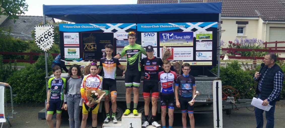 Nos Montgesnois Aurélien et Alexandre PLESSIS participaient ce dimanche, à la course d ‘Azé en Mayenne. Un circuit difficile de 7kms à parcourir 5 fois pour Aurélien et 9 fois pour Alexandre. En minime, au 3ème passage, une échappée de 6 coureurs dont Aurélien compta une trentaine de secondes d’avance sur