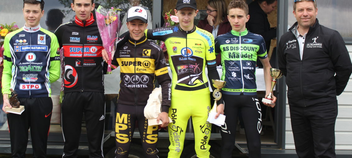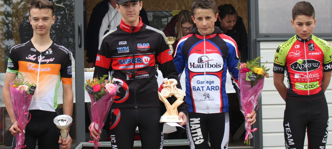Les cadets Hugo ROUSSET, Antonin DREUX, Wilson RAPICAULT, Louison LEBARBIER, Thomas TOUCHARD et Alexandre PLESSIS ont pris le départ quelques minutes avant les minimes dans un peloton de 39 coureurs. Une première échappée ou Hugo se mêla à ce groupe et c'est accroché pour tenir le plus longtemps possible ( bravo