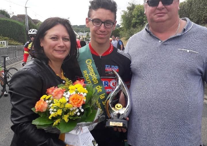 Ludwig QUONIAM a remporté dimanche 10 juin le maillot jaune sur ses 4 courses, il a reçu comme récompense une composition florale, le maillot jaune, un vase gravé et offert par Maskil BASTIEN charpentier à Champagné et un maillot COFIDIS et un sac offert par Nicolas EDET. Beau cadeau offert par