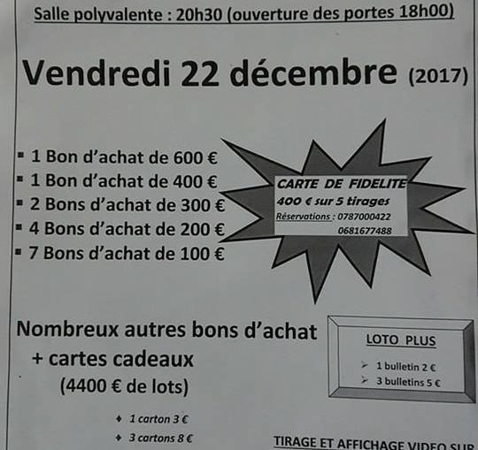 Vendredi est notre dernier loto de l'année. Alors faites de la publicité. Vous êtes tous les bienvenus pour donner un coup de main pour l’installation des tables, préparation de gâteaux par vos soins, encaisser les cartes de loto, vendre les boissons, gâteaux et casse croute, ranger les lotos plus et le