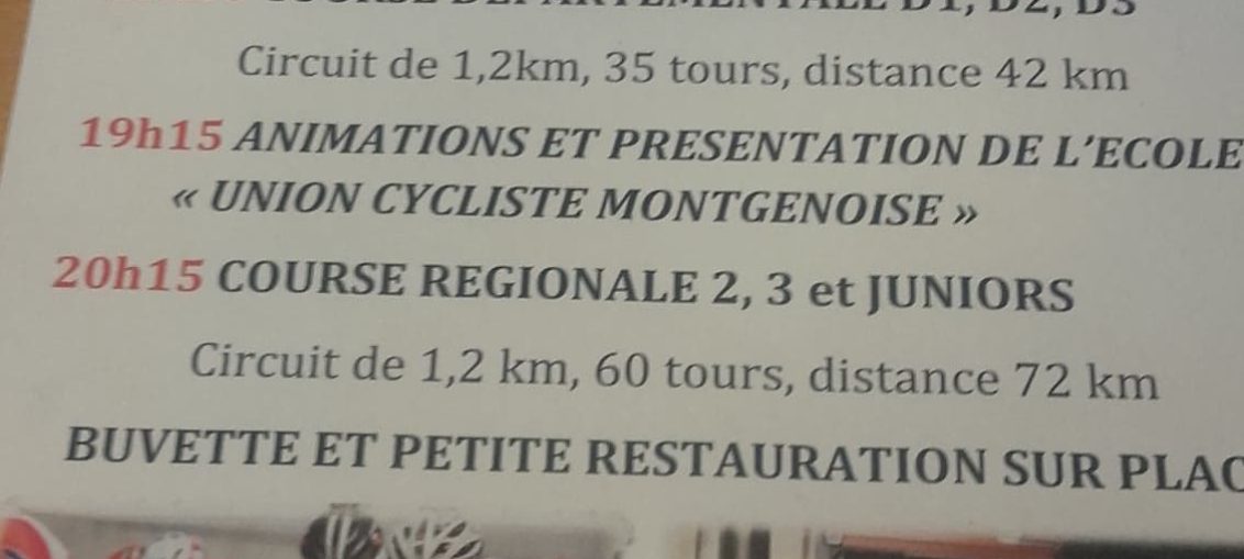 Course des D4: 9 tours, soit 54,9 km sur un parcours composé de faux plats, d'une petite cote, accompagnée du vent défavorable. Circuit beaucoup moins sélectif que l'an passé, malgré cela 31 partants et 27 classés. 2 montgesnois étaient présent Régis CISSE et Miguel GEORGES. Régis en plein effort et animateur de la course