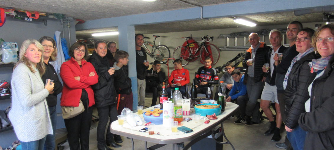 Pour la dernière course de la saison minimes cadets en Sarthe, un goûter est organisé en plein air. Vu les conditions climatiques un retranchement a eu lieu au sec chez Jacky ou gâteaux, popcorn, bonbons et boissons à gogo.