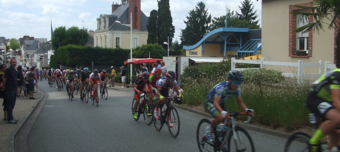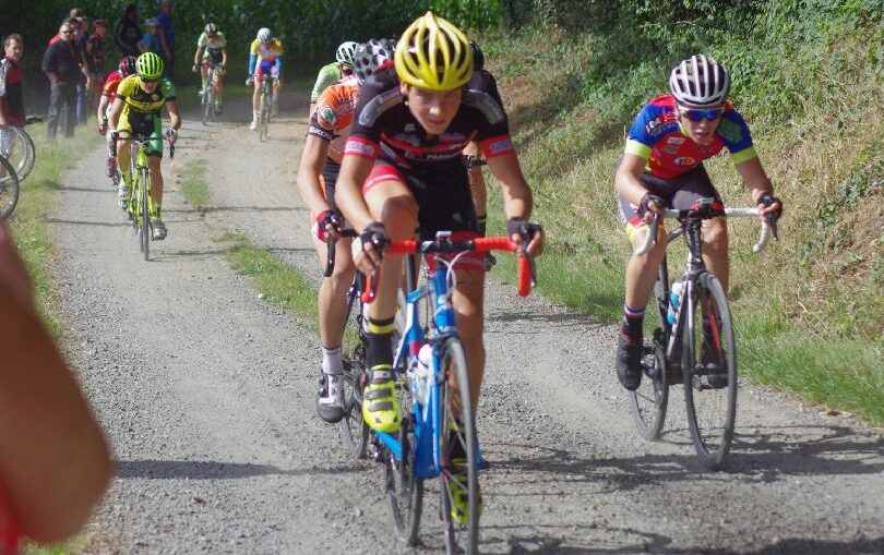 Une course un peu originale avec 8 tours de 5kms sur route et 8 tours de 3kms dont 600m de chemin empierré soit 64 kms en tout . Sur route le peloton est resté groupé puis sur passage du ribin, Julien Launay spécialiste du cyclocross s’envolait en solitaire . Puis
