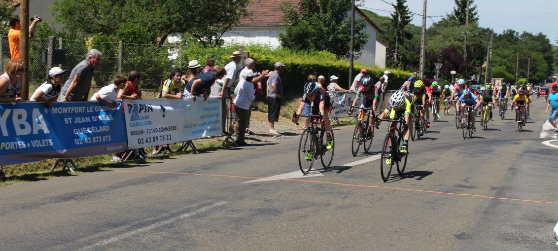 A Yvré L' Eveque 8 minimes de Montfort allaient se battre sous le soleil . La course se faisait par l ' arrière et c'est ainsi qu'un groupe de 13 allaient se présenter pour le sprint . Hélas pour nos coureurs ils n'ont pas entendu la cloche et se font