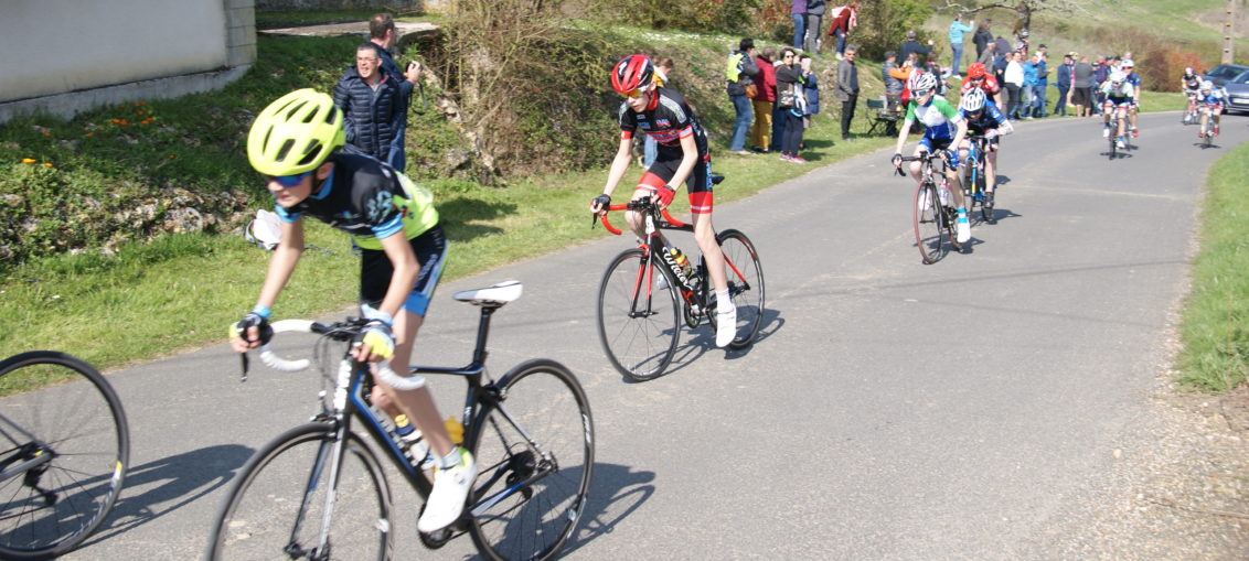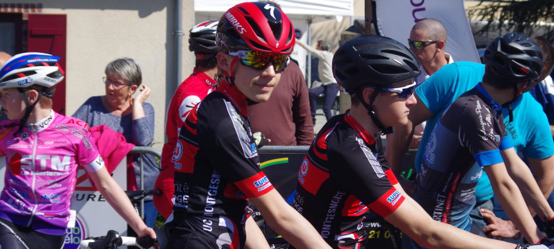 En minimes, 72 coureurs étaient engagés sur un circuit de 8.2 km à parcourir 4 fois. Aurélien PLESSIS qui représentait l’ UC Montgesnoise, gagna les 2 premiers sprints des points chauds. Ce qui permettra sans doute au futur vainqueur de choisir la bonne roue pour le sprint final… Après plusieurs attaques de
